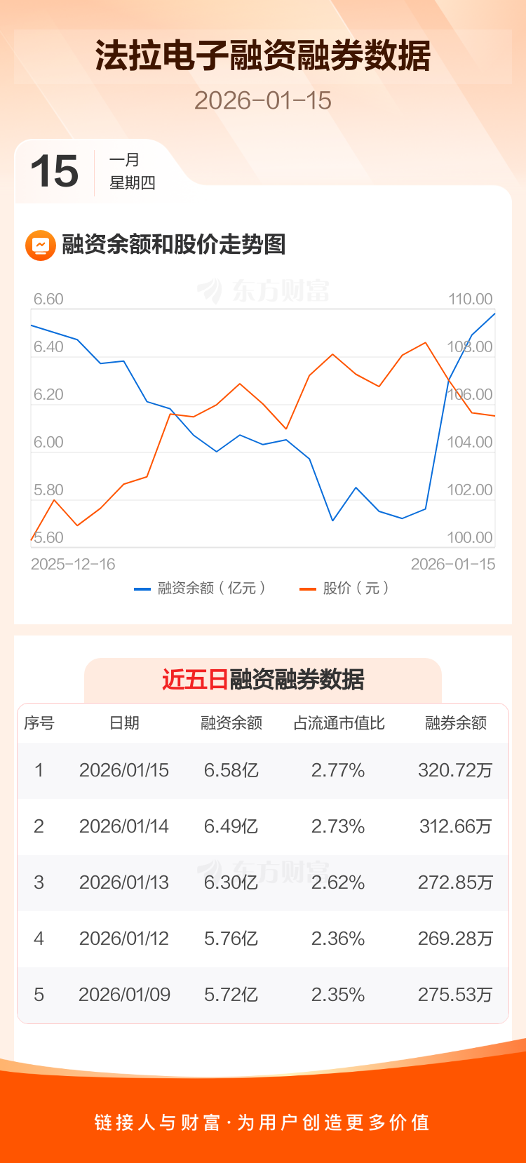 交易所最新数据显示,法拉电子于2026年1月15日获融资买入3845.85万元,融资偿还2964.53万元,当日融资净买入881.32万元。目前,该股融资余额6.58亿,占流通市值比例为2.77%。