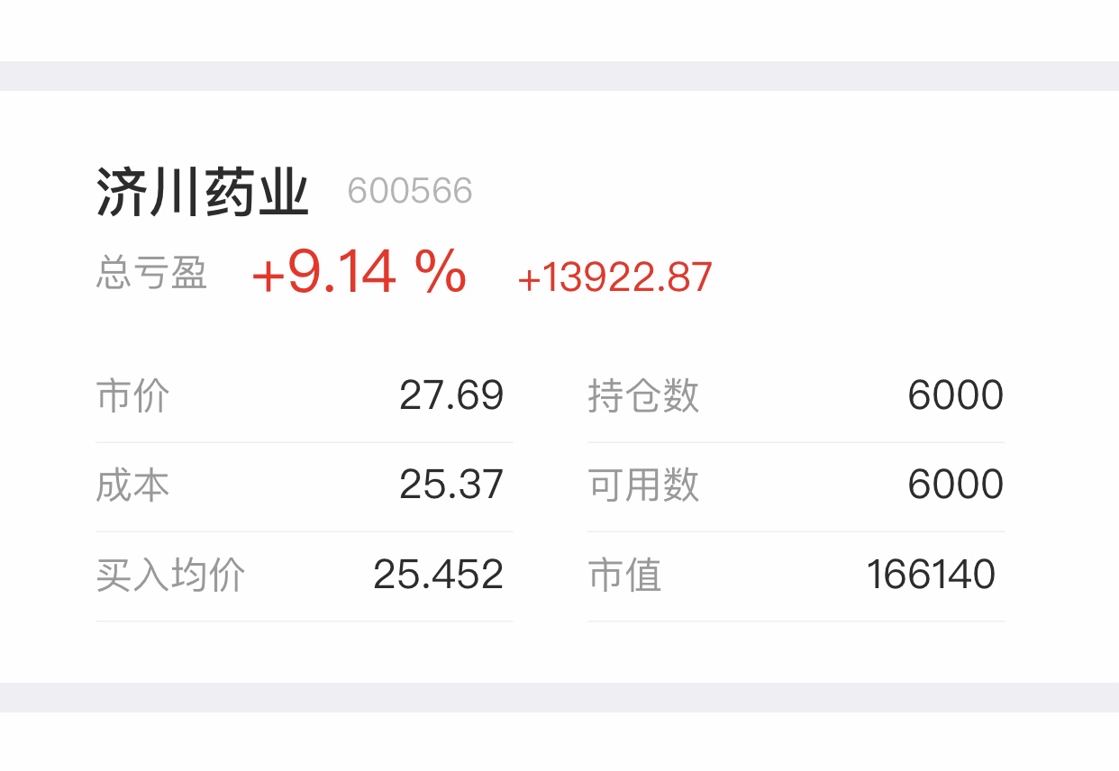 $济川药业(SH600566)$ 又盈利了,十四个股票只有华荣股份是绿的,真的赚的有点不好意思了