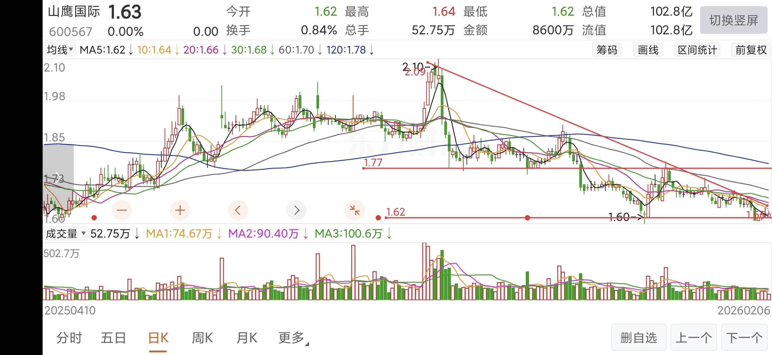 $山鹰国际(SH600567)$ 下跌趋势确实形成了,也看不到在这里反转的迹象,支撑位也看不到明显的做多力量入场,这次估计要回到一块二左右看能不能企稳。企稳之后还要反复的摸底才可能,不要在那里硬吹了,毫无意义。