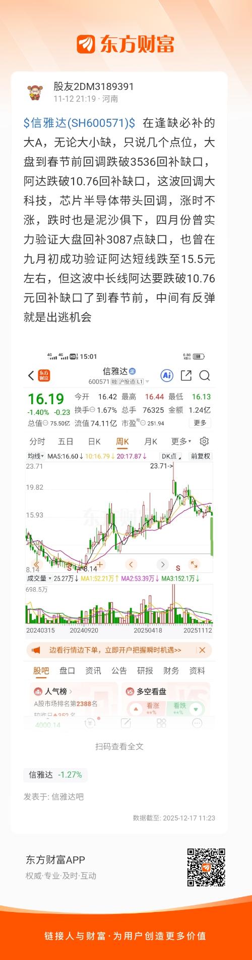 $信雅达(SH600571)$ 在逢缺必补的大A,无论大小缺,只说几个点位,大盘到春节前回调跌破3536回补缺口,阿达跌破10.76回补缺口,这波回调大科技,芯片半导体带头回调,涨时不涨,跌时也是泥沙俱下,四月份曾实力验证大盘回补3087点缺口,也曾在九月初成功验证阿达短线跌至15.5元左右,但这波中长线阿达要跌破10.76元回补缺口了到春节前,中间有反弹就是出逃机会