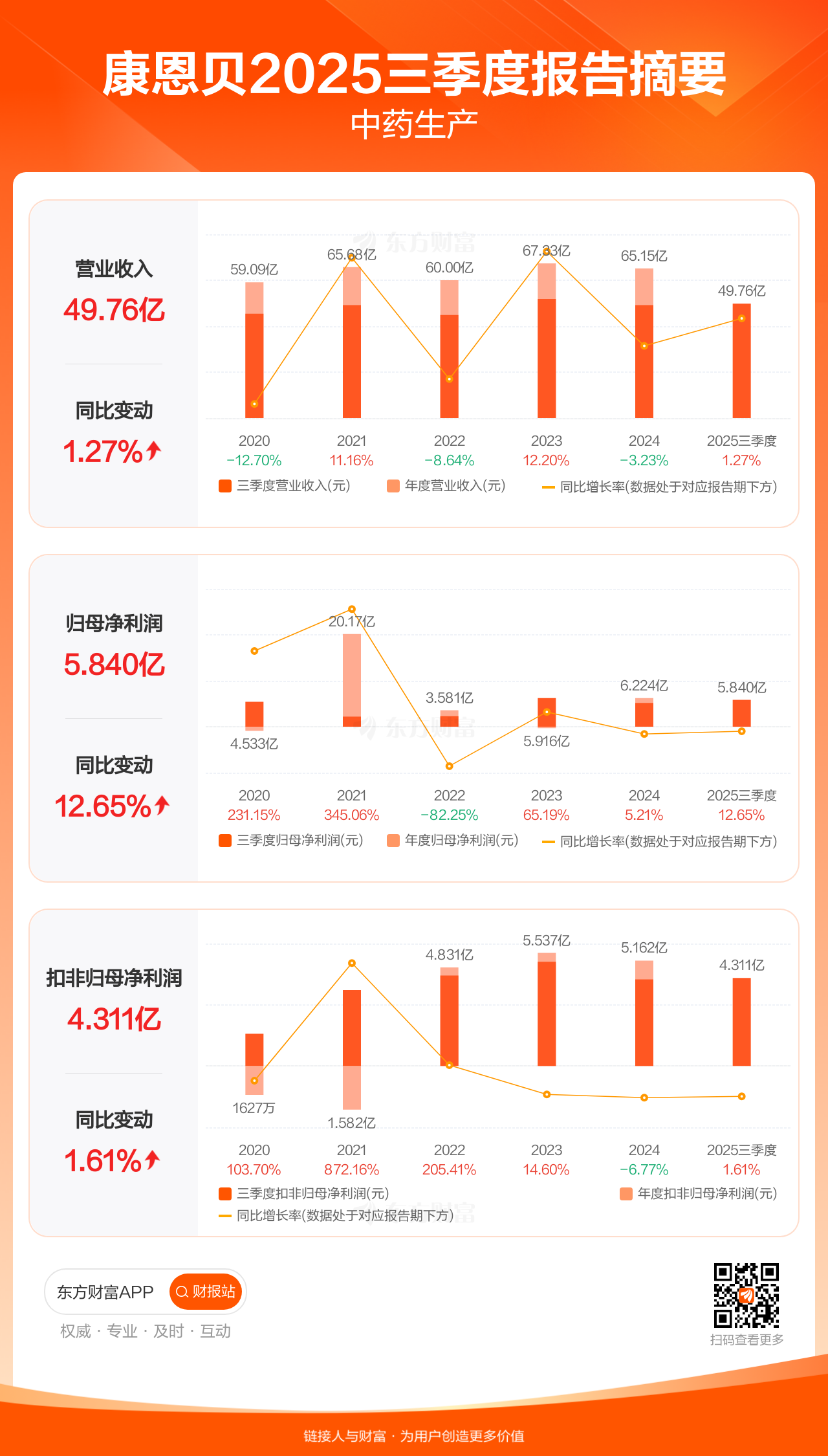 康恩贝10月29日发布2025年三季报显示,公司前三季实现营业收入49.76亿元,同比增长1.27%;归母净利润5.84亿元,同比增长12.65%;扣非归母净利润4.31亿元,同比增长1.61%。