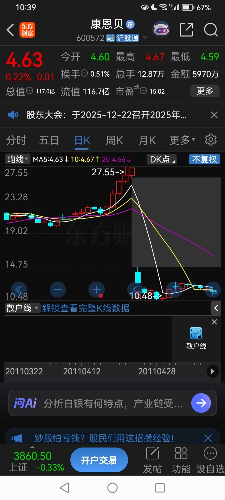 $康恩贝(SH600572)$ 回望过去。康恩贝给我成长的道路上积累了经验。时间回到2011年4月。那时候的庄家会利用规则玩死你。我在一周内1首康恩贝赚了近30%。除权那天一下子就把我的利润都吃光了。这就是上海市场和深圳的区别