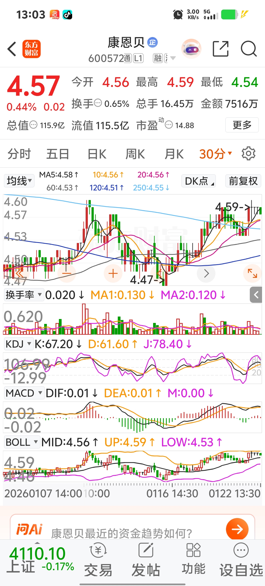 $康恩贝(SH600572)$ 怎么看分时线这样哈?下一阶段走向那里呢?同学们怎么看,这个铁牛,就系移动几分红,给你们赚得些吃快餐钱喔!