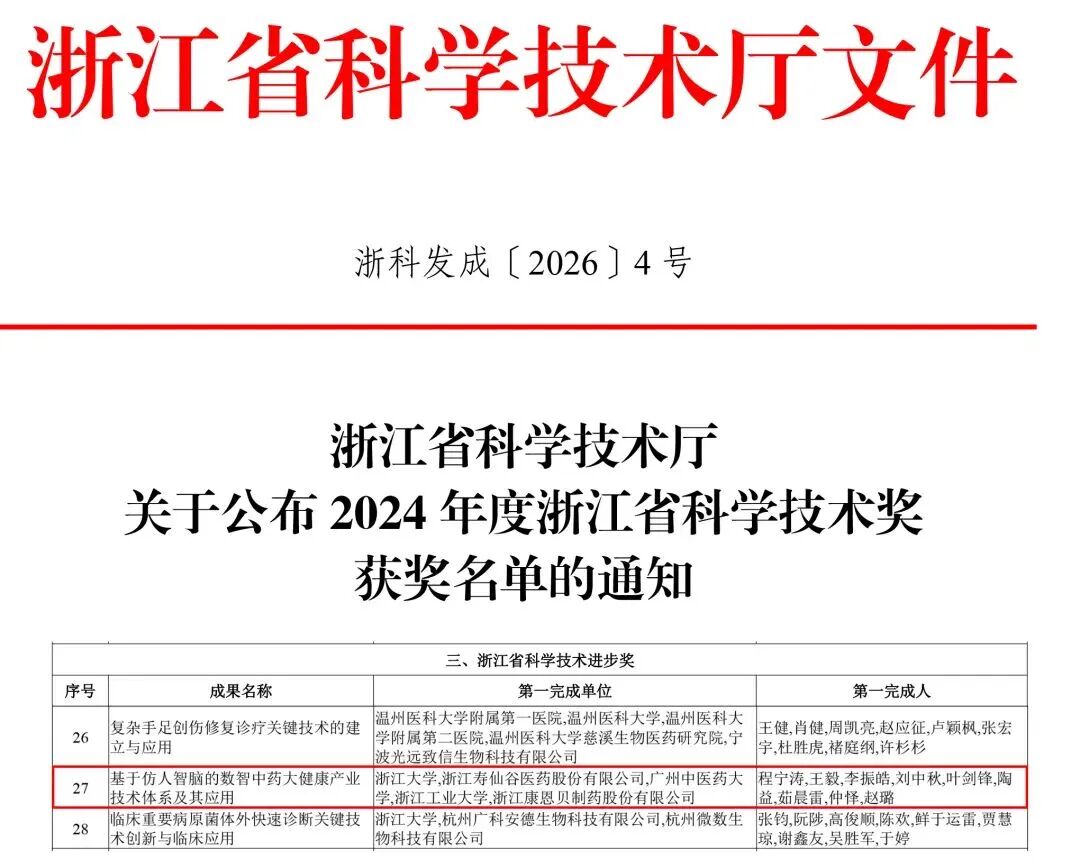 2月9日,全省建设一流创新生态打造最具竞争力营商环境大会在杭州举行。大会表彰了2024年度浙江省科学技术奖305项。其中,康恩贝股份参与的“基于仿人智脑的数智中药大健康产业技术体系及其应用”荣获浙江省科学技术进步奖二等奖。