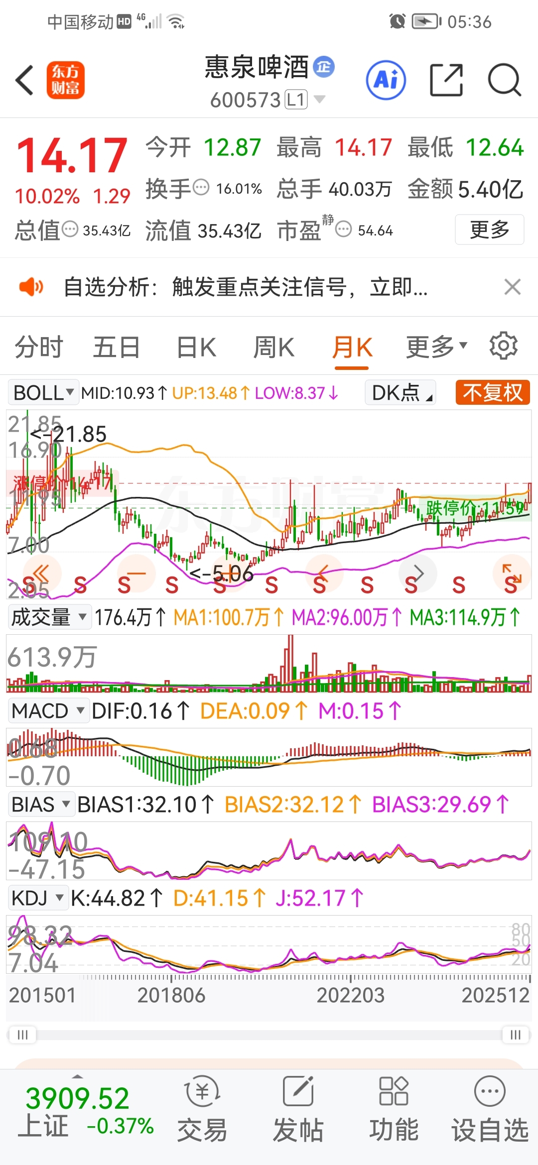 $惠泉啤酒(SH600573)$ #复盘记录# 45日线级别多头排列,后期加速上涨。