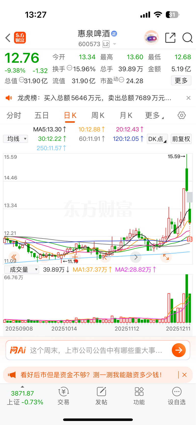 $惠泉啤酒(SH600573)$ 生死有命,富贵在天。随意吧。到处都是A杀,我就选个A杀的最狠的