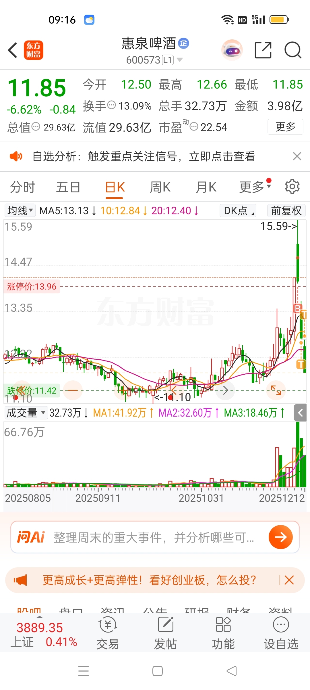 $惠泉啤酒(SH600573)$ 亏了14个点,这是想好事不卖的后果。才第一个涨停。想好事呢。结果你的和主力的正好相反。等你真正买进去了,主力还带你玩吗?