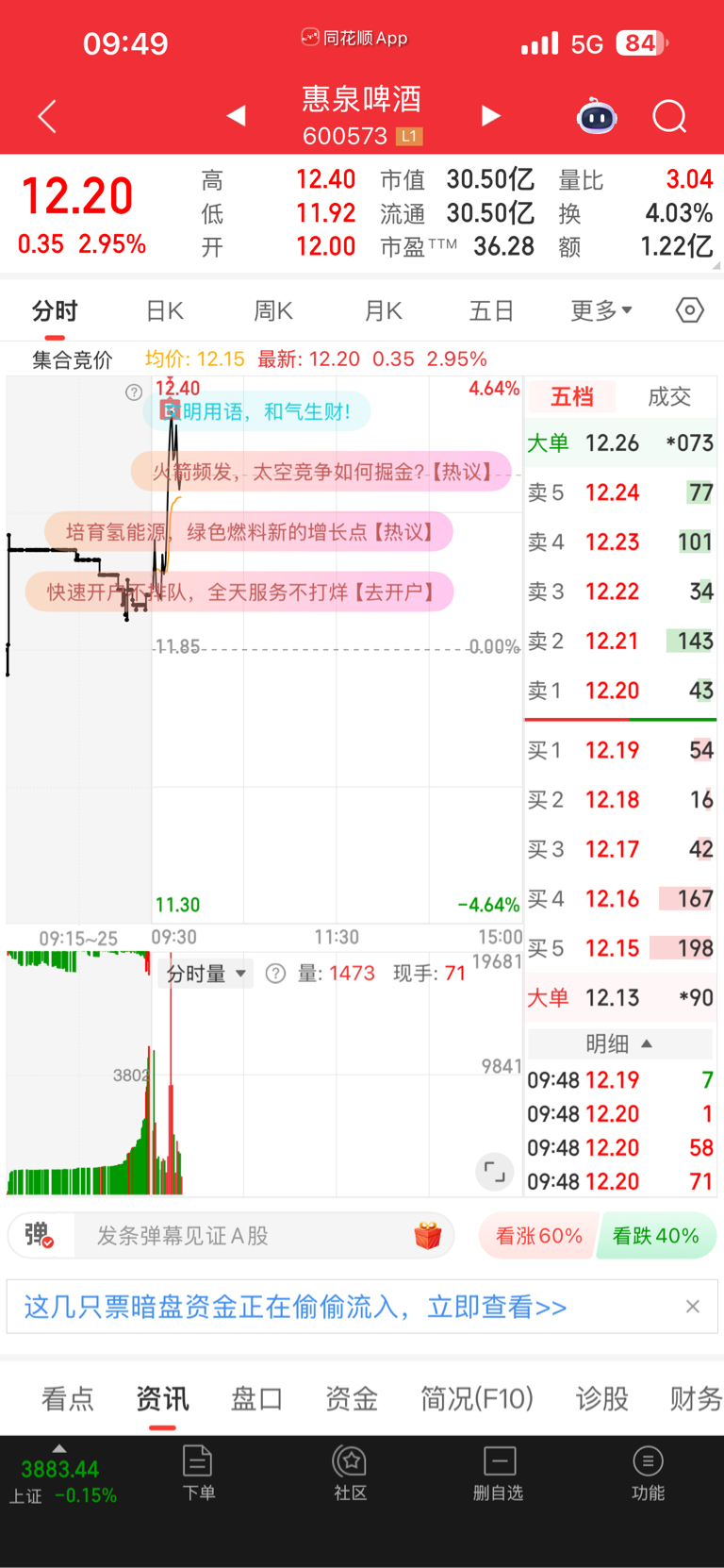$惠泉啤酒(SH600573)$ 12.40买的,买在最高点,亏了20多个点,加仓又加在山顶尖,晕死