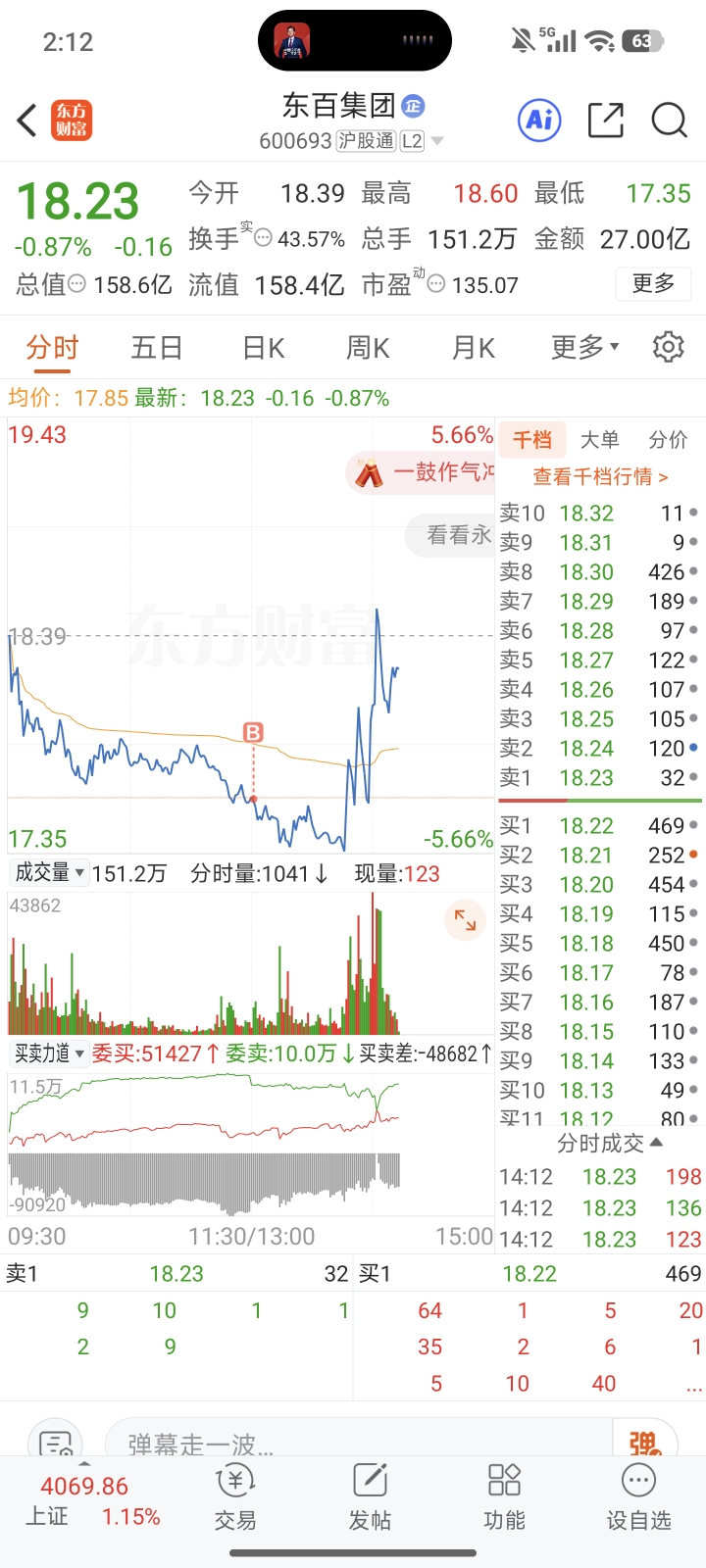 下午开盘买了半仓你,半仓东百,东百拉起来了你能争点气吗
