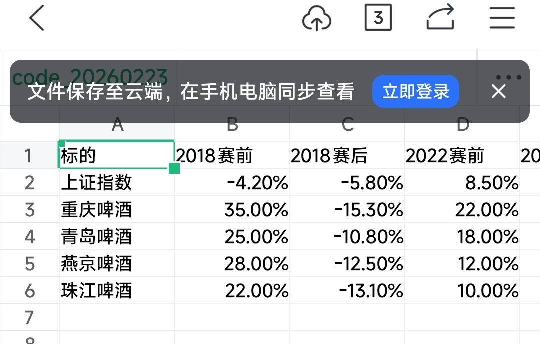 $惠泉啤酒(SH600573)$ 珠江刚公布了业绩,燕京业绩也不错。今年夏季美加墨世界杯墨,上一次2018夏季是卡塔尔世界杯啤酒板块大涨,2022年是冬季俄罗斯世界杯不做参考