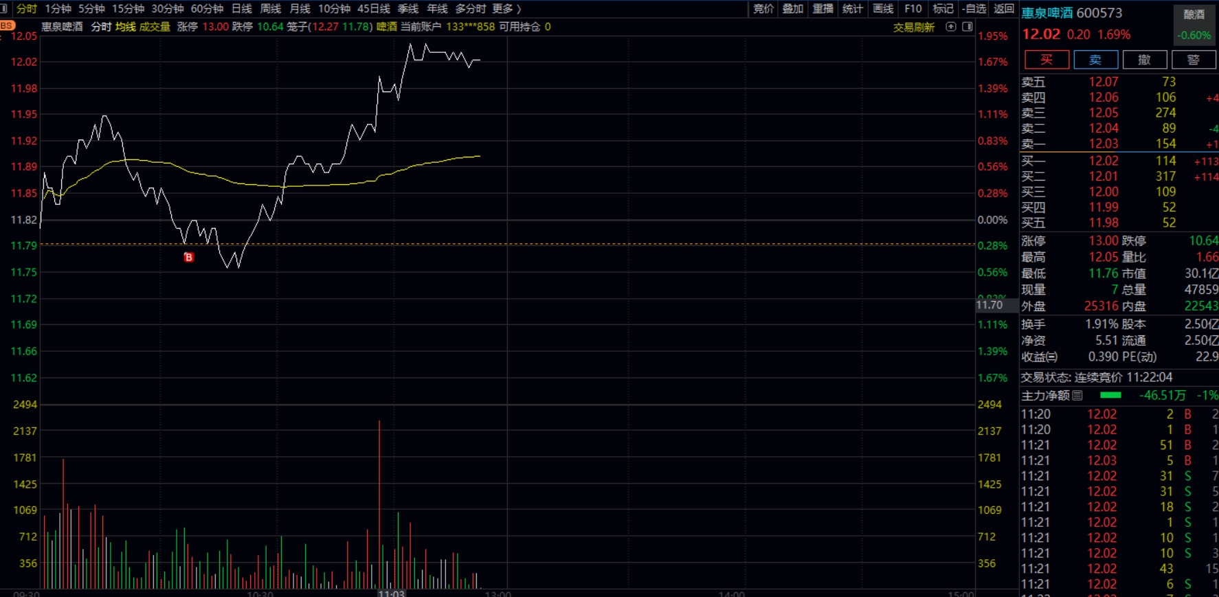 $惠泉啤酒(SH600573)$ 先建100手的底仓