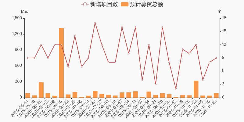 本周(2025/11/16-2025/11/23)共新增9例定增预案,预计募集资金共计89.12亿元,新增项目数量环比增加1例,预计募资总额环比增长52.55亿。