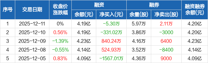 淮河能源:融资净偿还5.3万元,融资余额4.19亿元(12-11)
