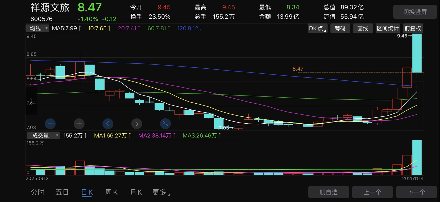 155.2万手历史天量,收盘价8.47划一条线,线上参与。