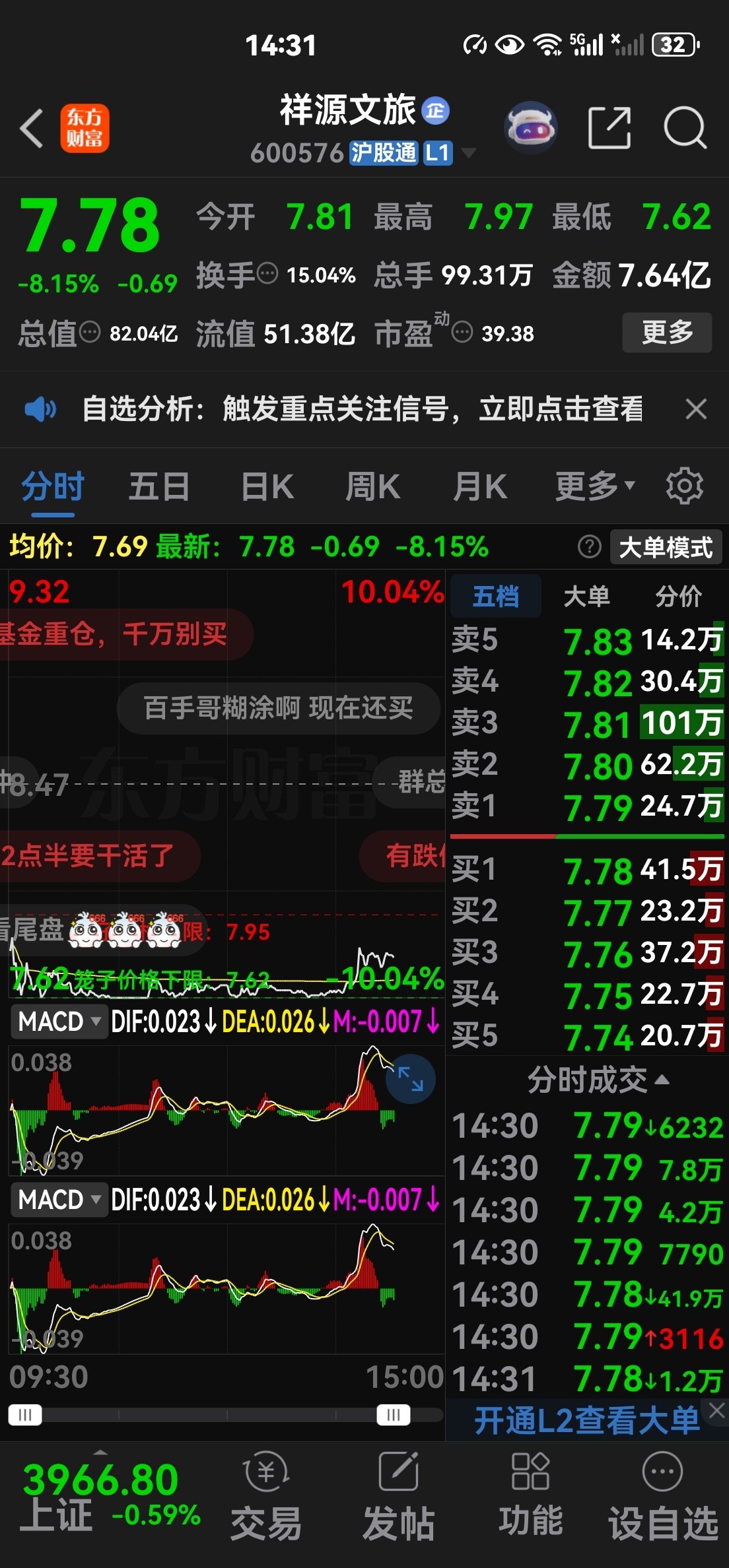 $祥源文旅(SH600576)$ 【7.79元买入】开始啦,切后要风得风,明天8.36跑