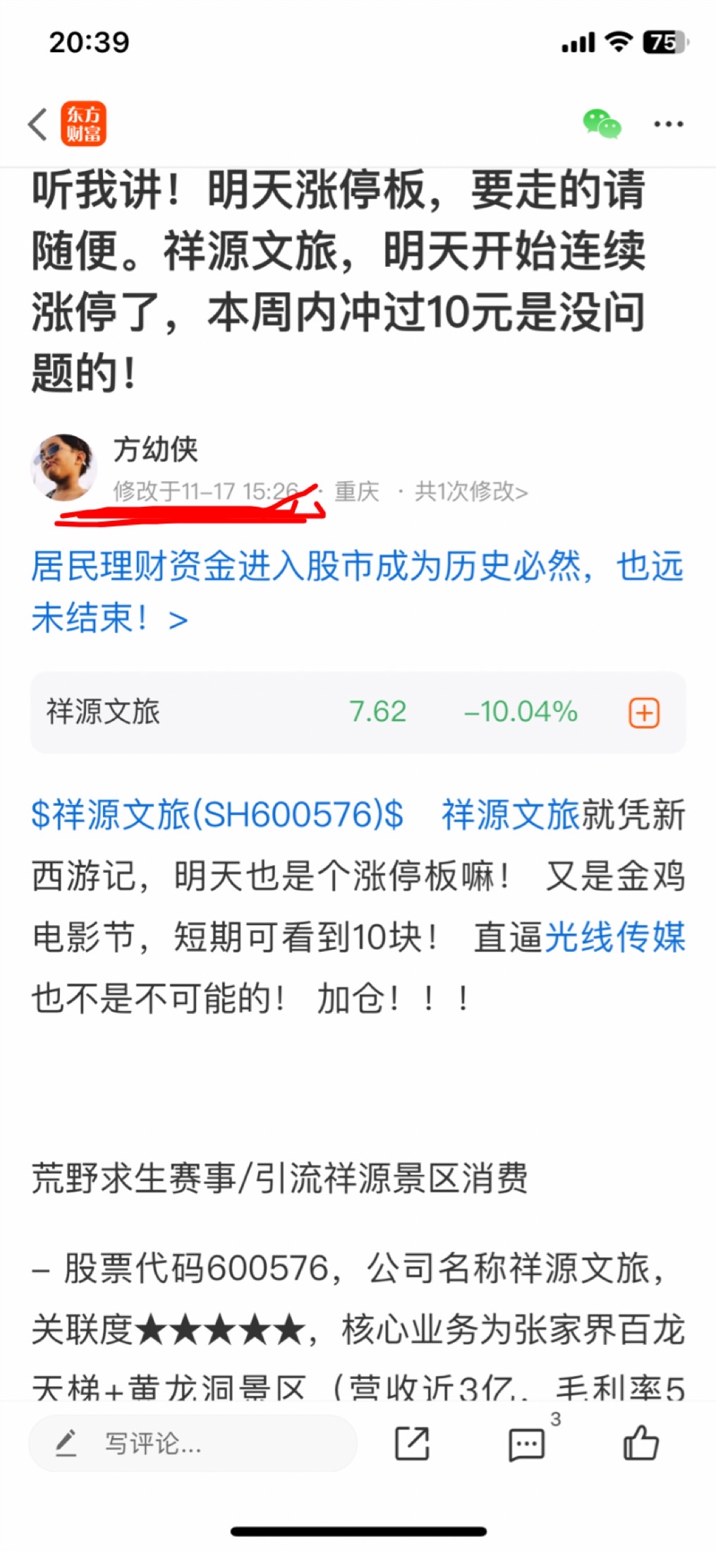 看!我说明天继续涨停,本周冲过10元!这不增资了嘛!重大利好! 我现在亏了20%都不得走!成为祥源股东,还可以免费旅游!