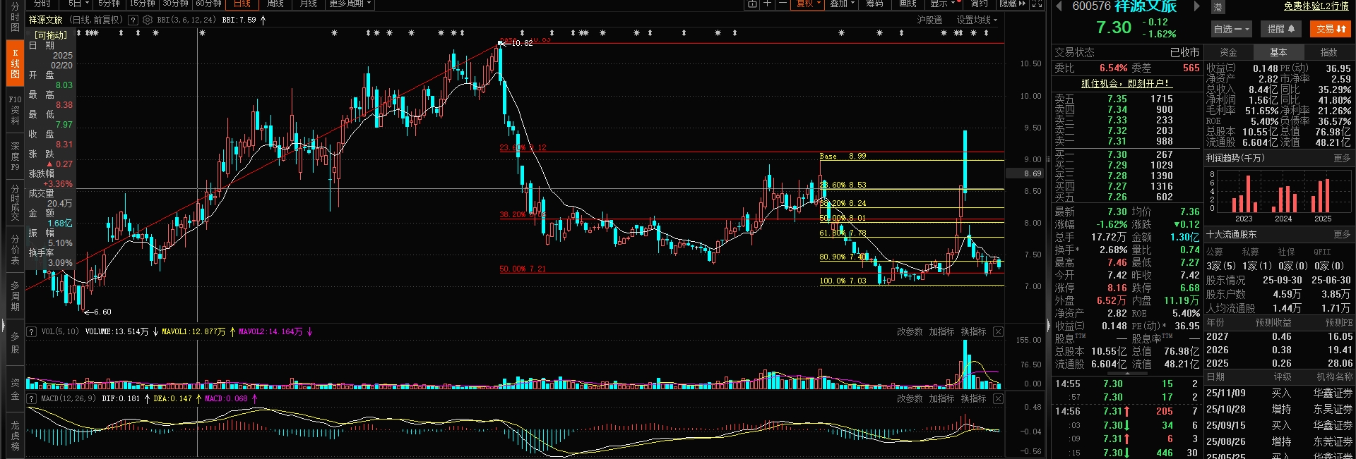 祥源文旅今天小幅度高开后,跟着大盘和板块一起无量砸下来,尾盘收回到7.3,没给黄金分割位的7.21回踩。等明天看能不能收稳7.21,有子弹的可以加仓。