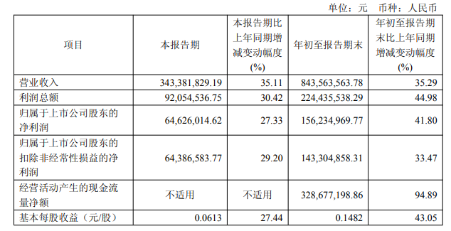 2025年前三季度,公司实现营业收入8.44亿元,同比增长35.29%;利润总额2.24亿元,同比增长44.98%;归母净利润1.56亿元,同比增长41.80%。