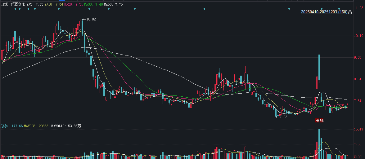 二级市场上,截至12月3日午间收盘,祥源文旅上涨1.76%报7.50元/股,总市值约79.09亿元,今年来公司股价累计上涨约8.85%。