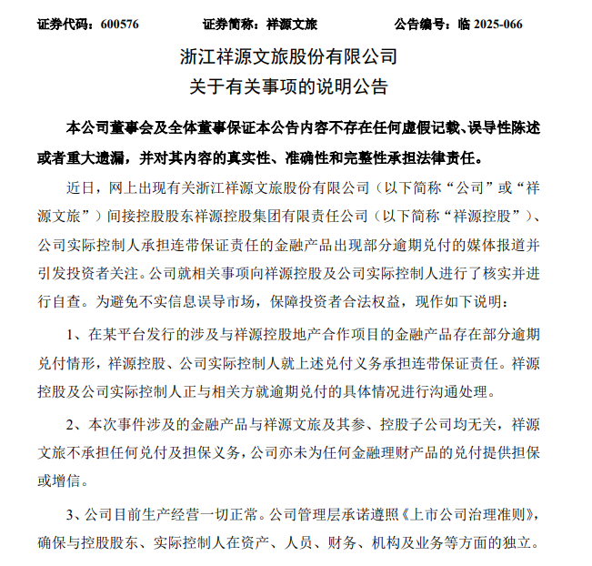 12月7日,祥源文旅发布公告称,在某平台发行的涉及与祥源控股地产合作项目的金融产品存在部分逾期兑付情形,祥源控股、公司实际控制人就上述兑付义务承担连带保证责任。祥源控股及公司实际控制人正与相关方就逾期兑付的具体情况进行沟通处理。本次事件涉及的金融产品与祥源文旅及其参、控股子公司均无关,祥源文旅不承担任何兑付及担保义务,公司亦未为任何金融理财产品的兑付提供担保或增信。