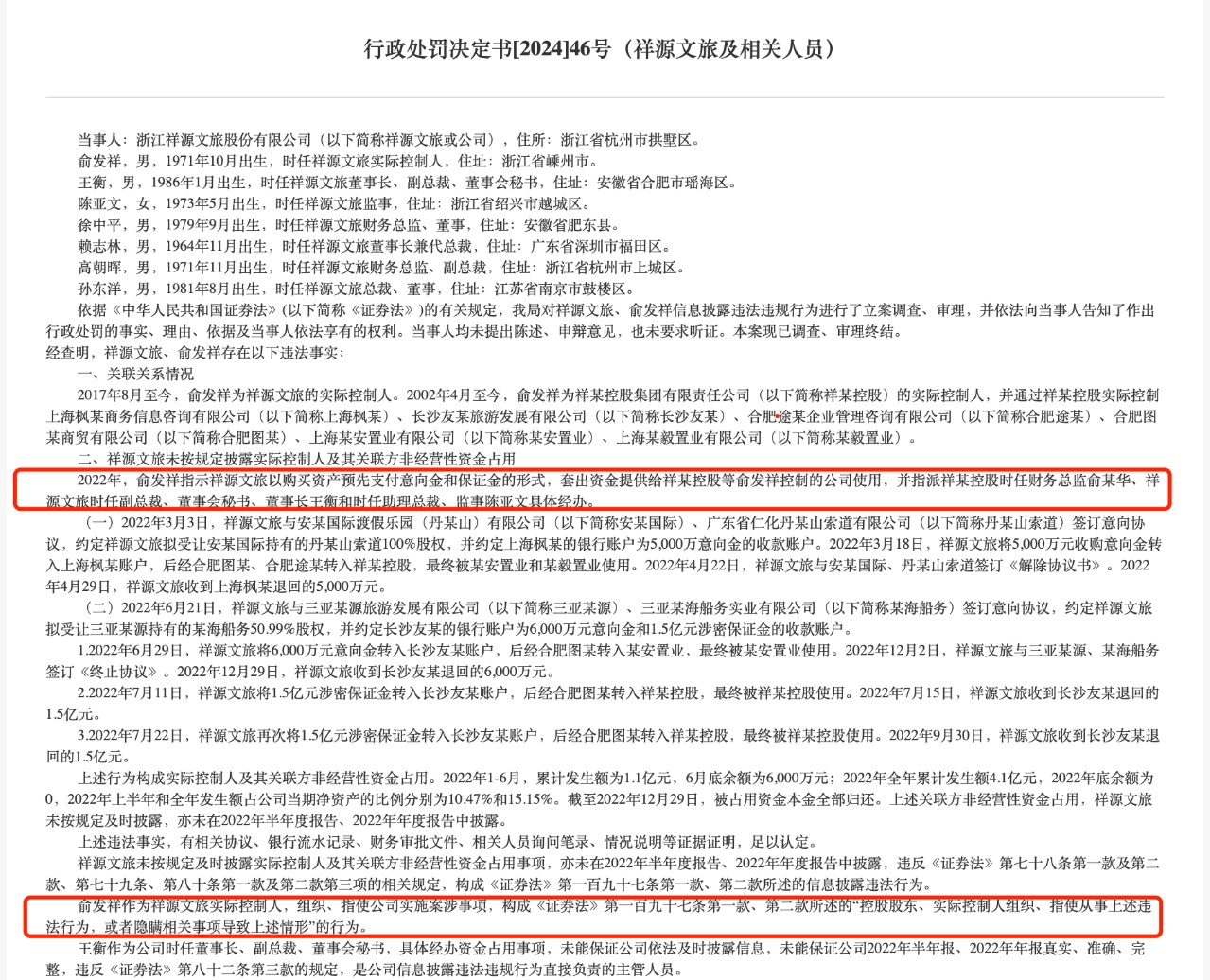 “祥源系”的治理问题在去年就已显露。2024年12月17日,浙江证监局发布《行政处罚决定书〔2024〕46号》,对祥源文旅及相关人员做出行政处罚,揭露了公司实际控制人俞发祥及关联方非经营性资金占用的事实。