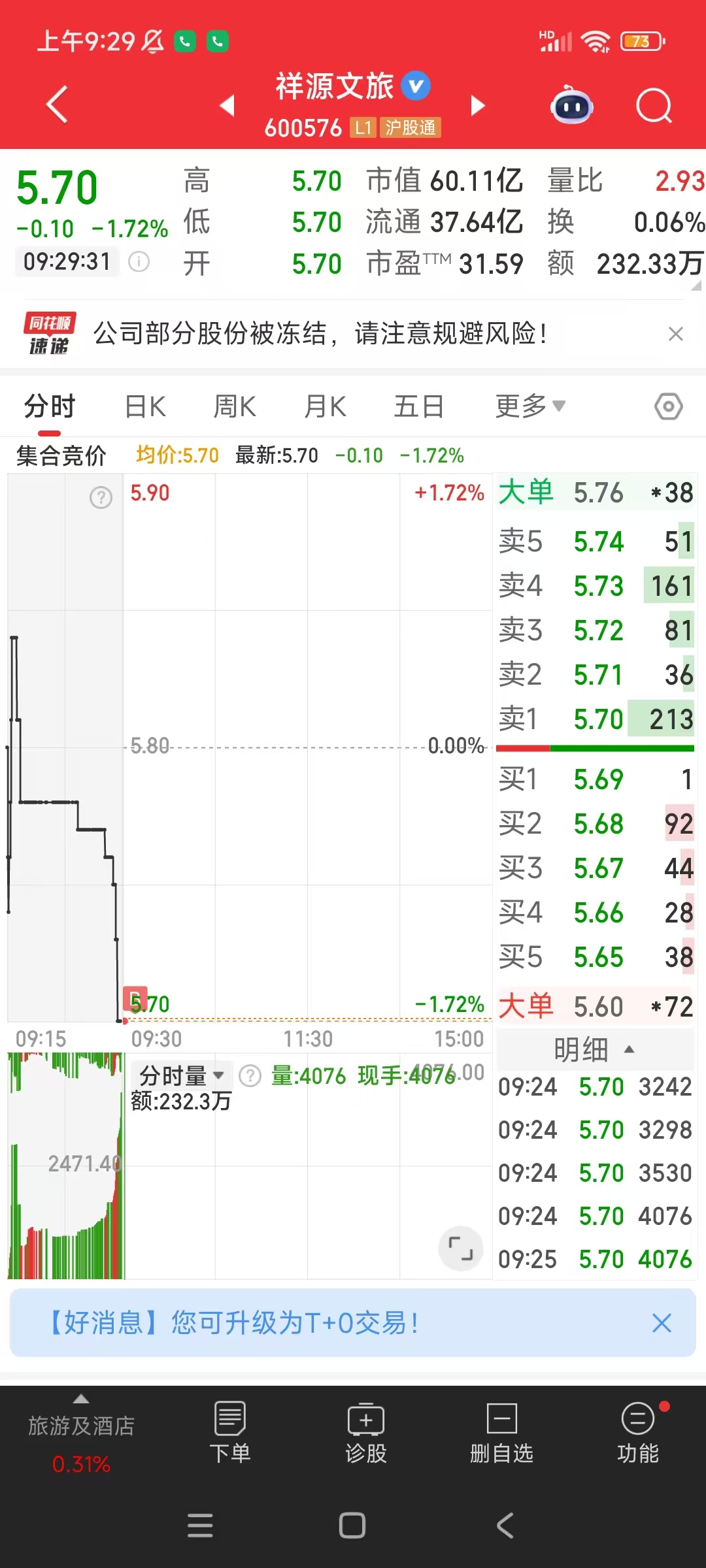 $祥源文旅(SH600576)$ 完蛋了,竞价前没看公告,9点25后才看到公告,买了36手,周一5.81买昨天5.83跑的。郁闷