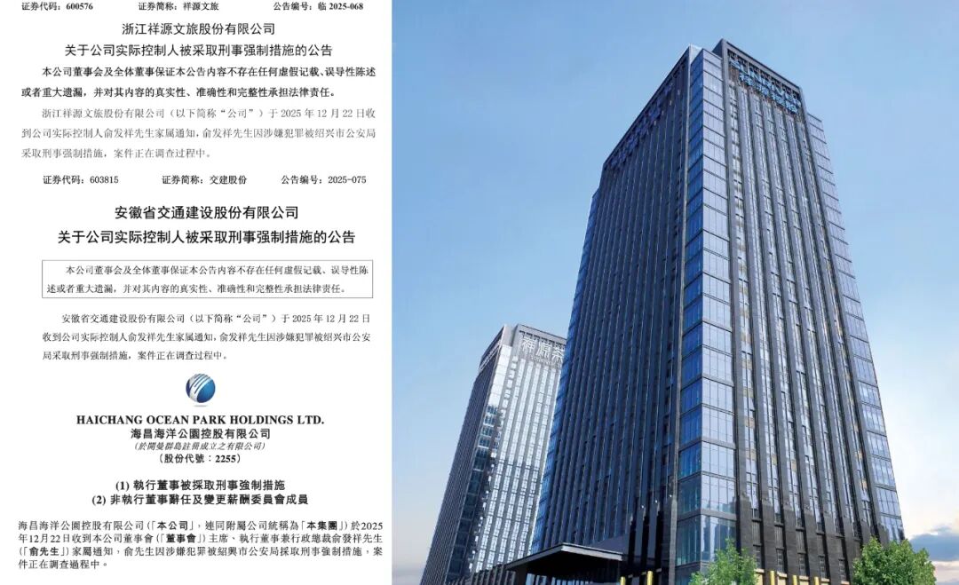 12月22日晚,祥源系三家上市公司陆续公告,收到实控人俞发祥家属通知,俞因涉嫌犯罪,由绍兴市公安局采取刑事强制措施,案件正在调查过程中。