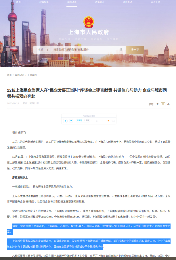 $XD精达股(SH600577)$ 要相信上海市经信委、上海市科委还有上海市国资委的水平!看看上海市政府官网的这句原话“得益于金融资源的精准匹配,上海超导、芯耀辉、智元机器人、御风未来等一批“硬科技”企业加速成长,成为培育新质生产力的重要生力军”,能排在智元之前,别的还有啥需要考虑的呢?