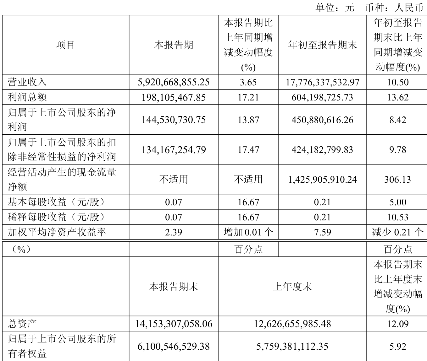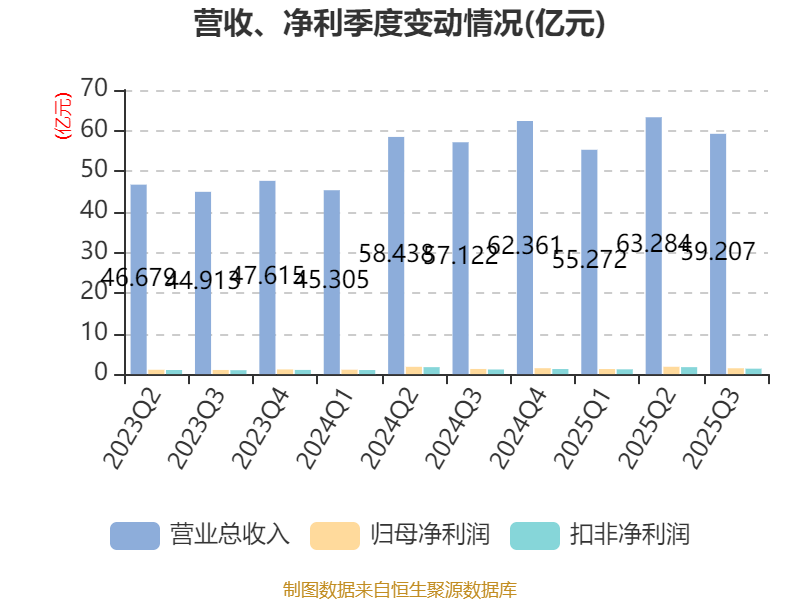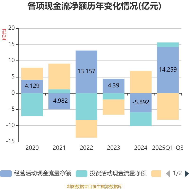 2025年前三季度,公司经营活动现金流净额为14.26亿元,同比增加21.18亿元;筹资活动现金流净额-8.22亿元,同比减少18.41亿元;投资活动现金流净额1.4亿元,上年同期为-1.94亿元。