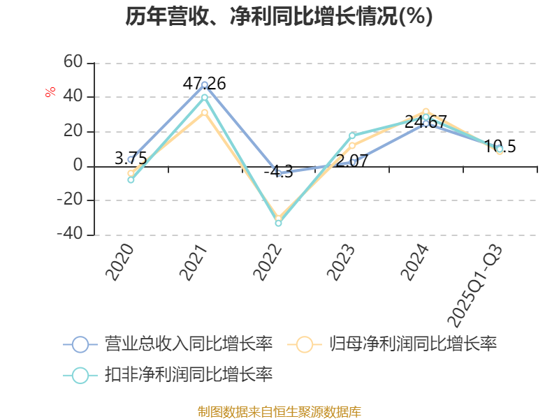 资产重大变化方面,截至2025年三季度末,公司货币资金较上年末增加98.94%,占公司总资产比重上升6.86个百分点;其他流动资产较上年末减少85.67%,占公司总资产比重下降2.85个百分点;应收票据及应收账款较上年末增加7.4%,占公司总资产比重下降1.94个百分点;固定资产较上年末减少3.16%,占公司总资产比重下降1.83个百分点。