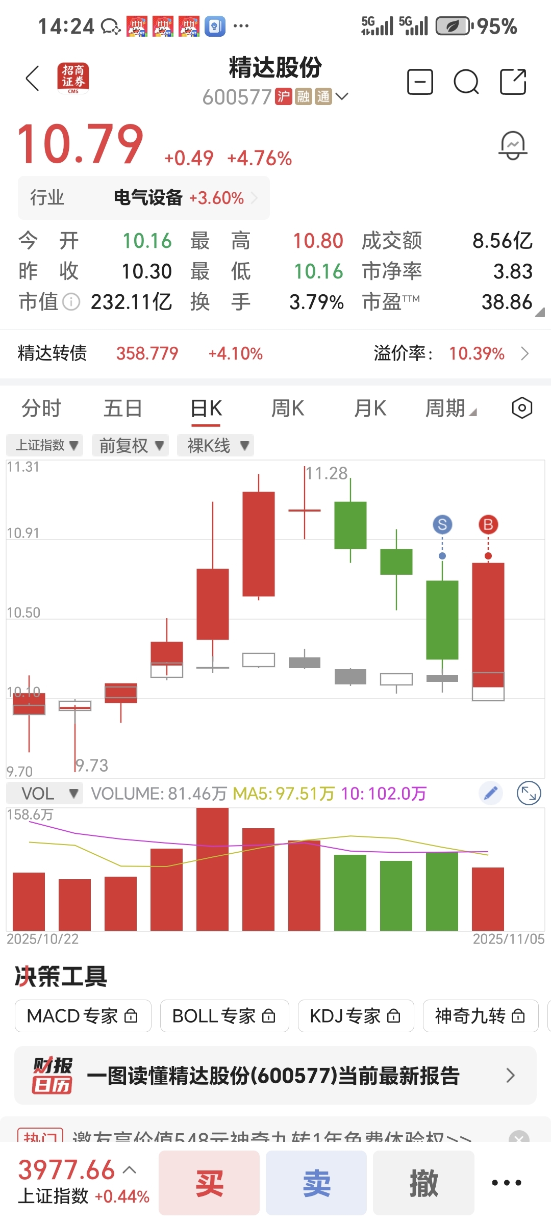 $精达股份(SH600577)$ 昨天10.28出,今早着不对,7.38又买进来了