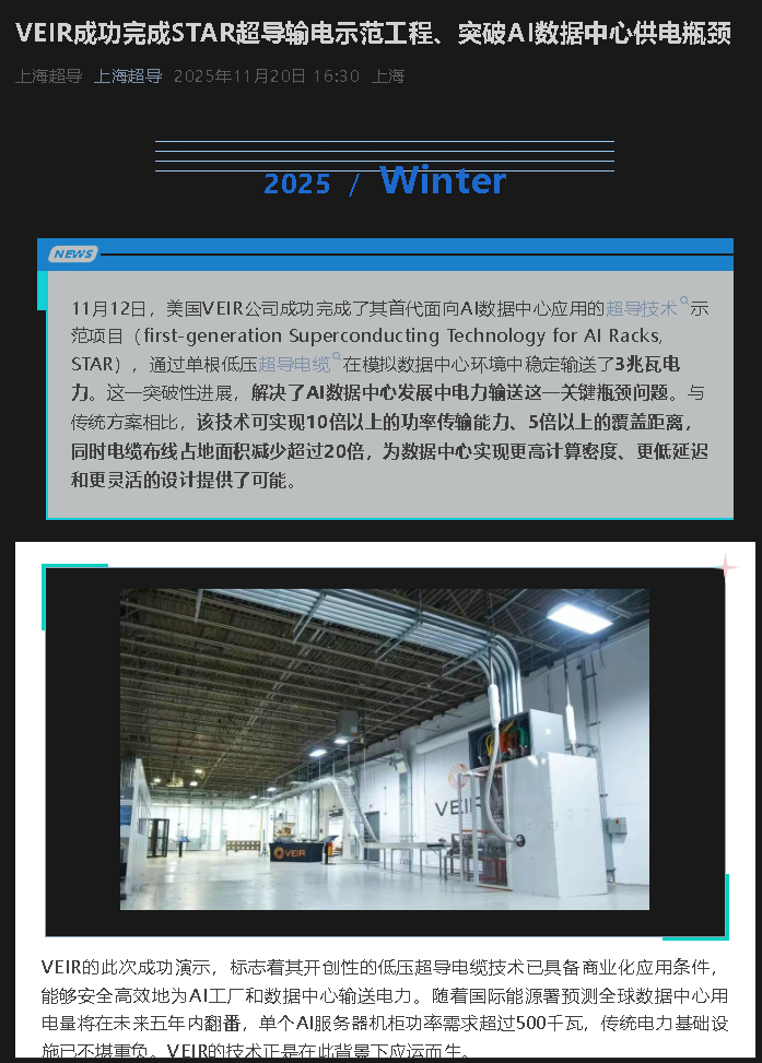 11月20日的旧闻,大家看到没:VEIR成功完成STAR超导输电示范工程、突破AI数据中心供电瓶颈