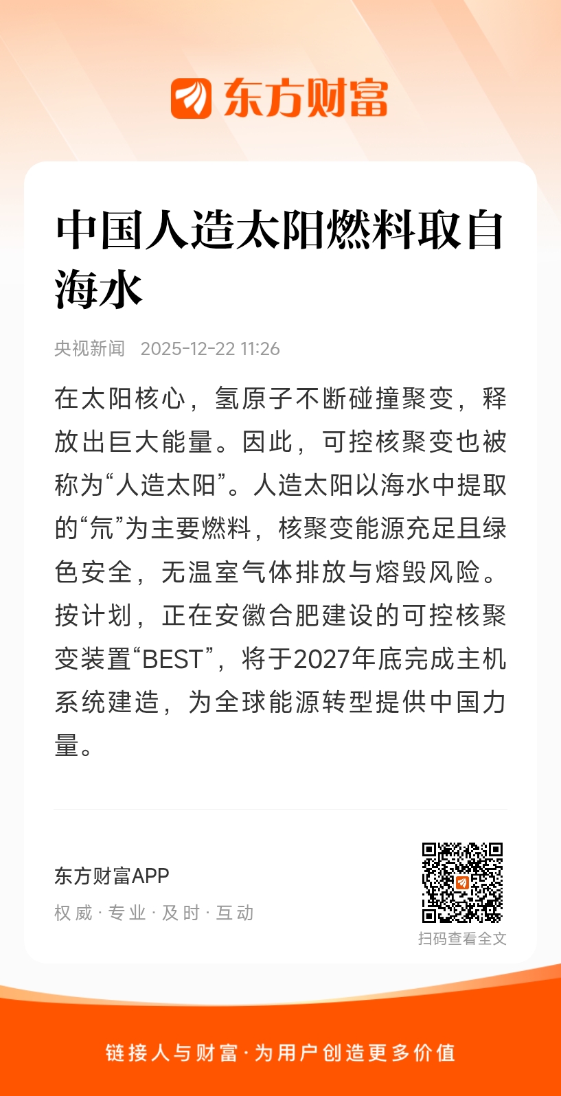 在太阳核心,氢原子不断碰撞聚变,释放出巨大能量。因此,可控核聚变也被称为“人造太阳”。人造太阳以海水中提取的“氘”为主要燃料,核聚变能源充足且绿色安全,无温室气体排放与熔毁风险。按计划,正在安徽合肥建设的可控核聚变装置“BEST”,将于2027年底完成主机系统建造,为全球能源转型提供中国力量。