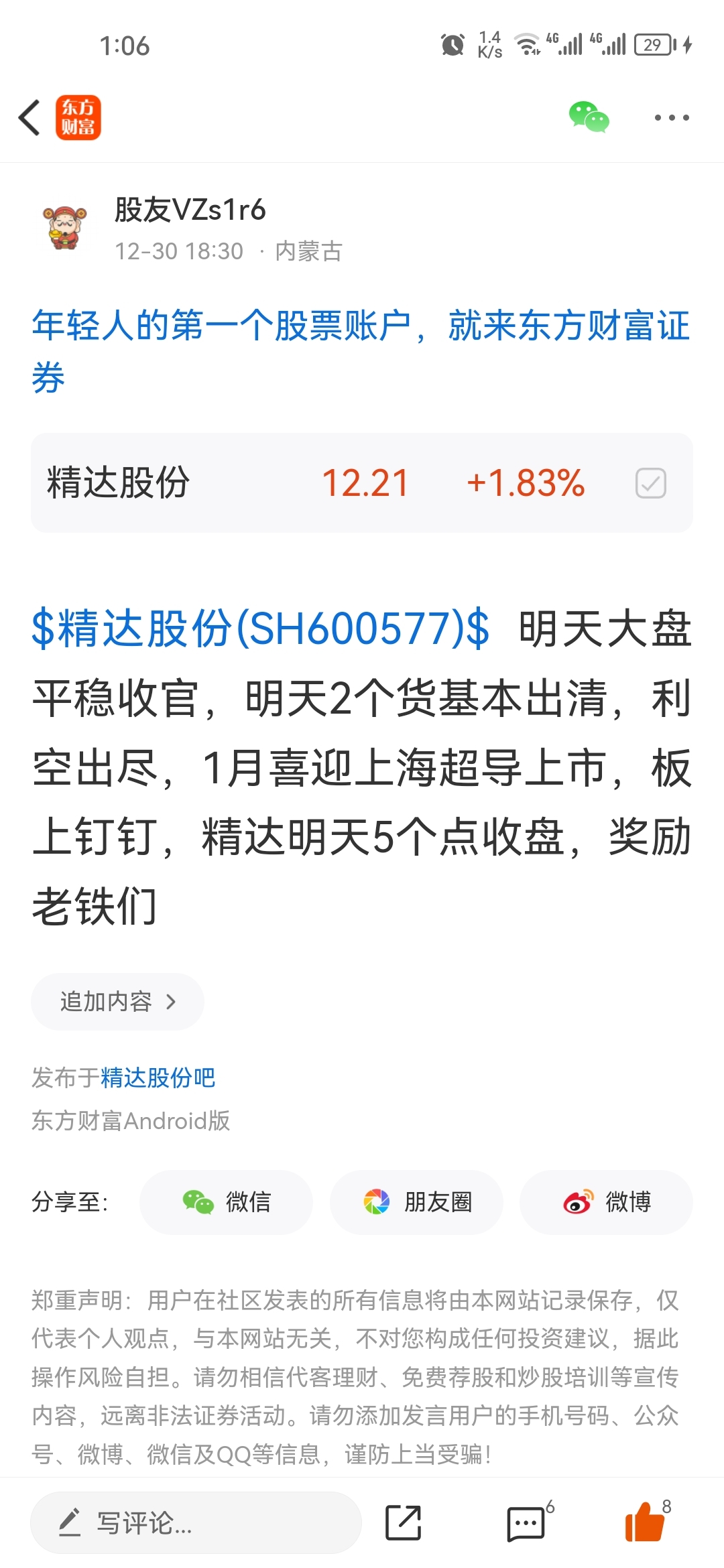 温馨提示: 1.根据《证券法》规定,禁止编造、传播虚假信息或者误导性信息,扰乱证券市场;2.用户在本社区发表的所有资料、言论等仅代表个人观点,与本网站立场无关,不对您构成任何投资建议。用户应基于自己的独立判断,自行决定证券投资并承担相应风险。《东方财富社区管理规定》