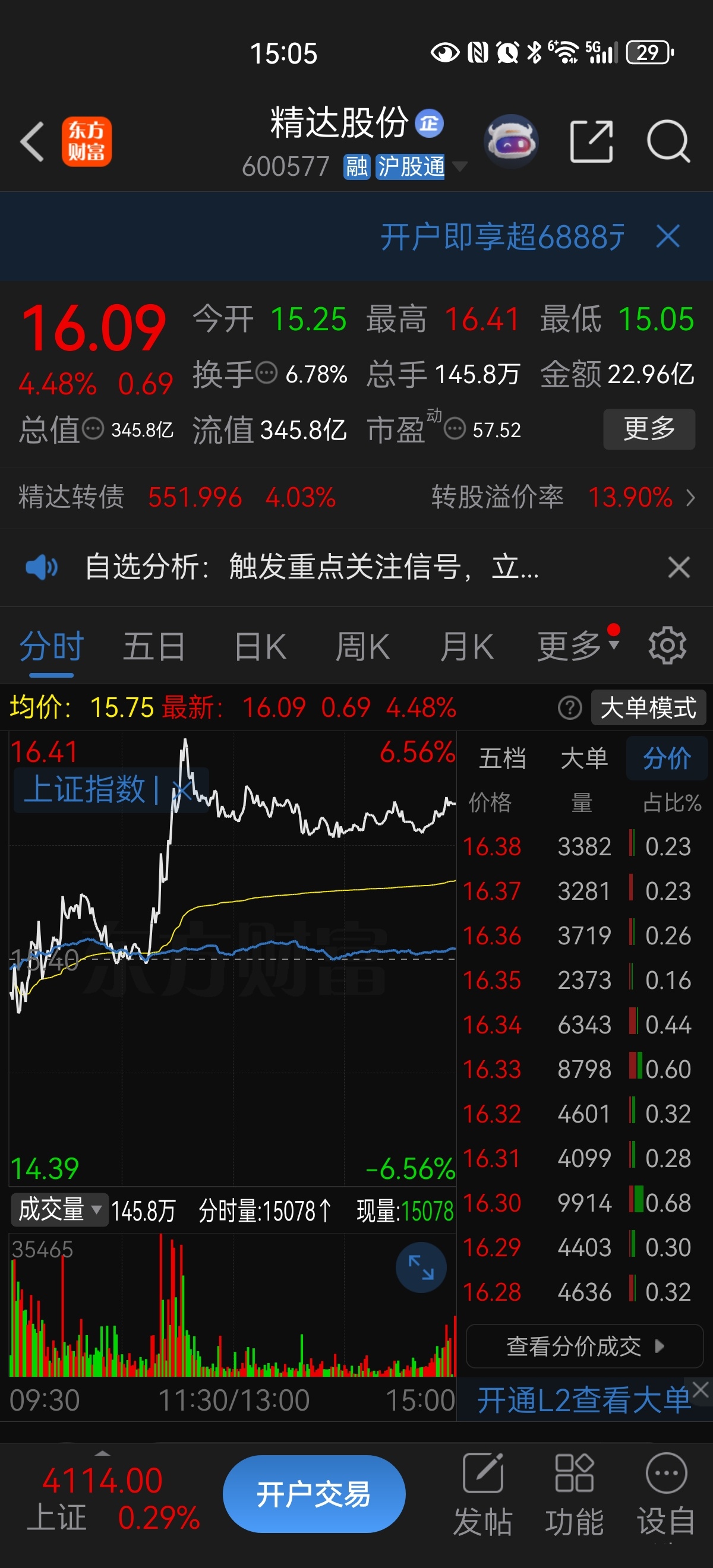 今日主力成本在16.06,因此,最低会在这个价位上波动,主力会维护这个价位的。但