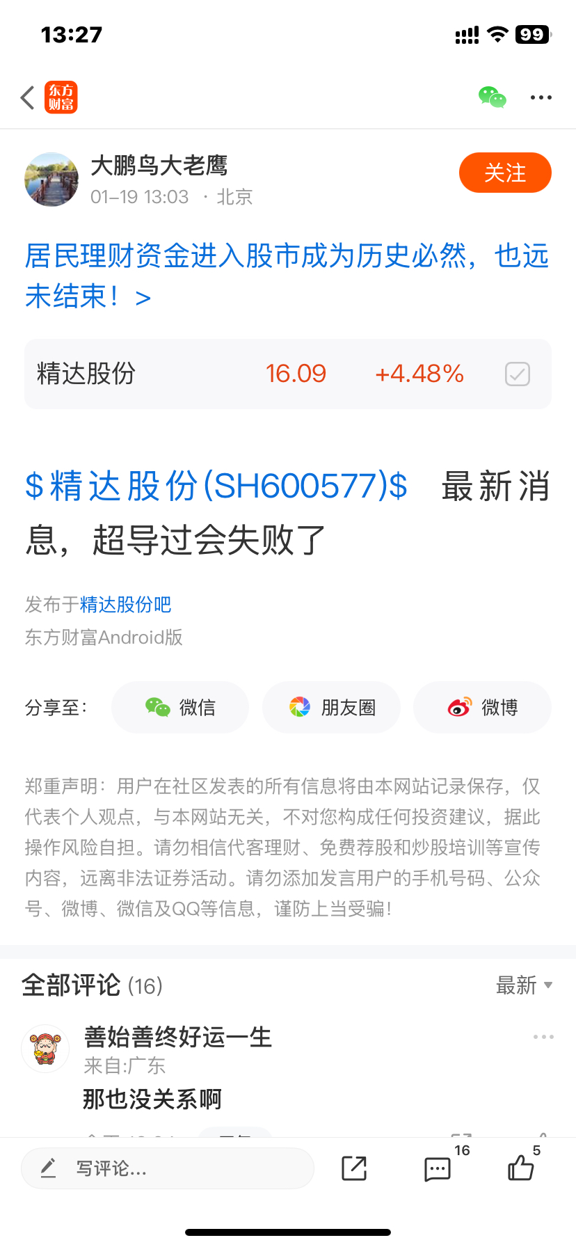 温馨提示: 1.根据《证券法》规定,禁止编造、传播虚假信息或者误导性信息,扰乱证券市场;2.用户在本社区发表的所有资料、言论等仅代表个人观点,与本网站立场无关,不对您构成任何投资建议。用户应基于自己的独立判断,自行决定证券投资并承担相应风险。《东方财富社区管理规定》