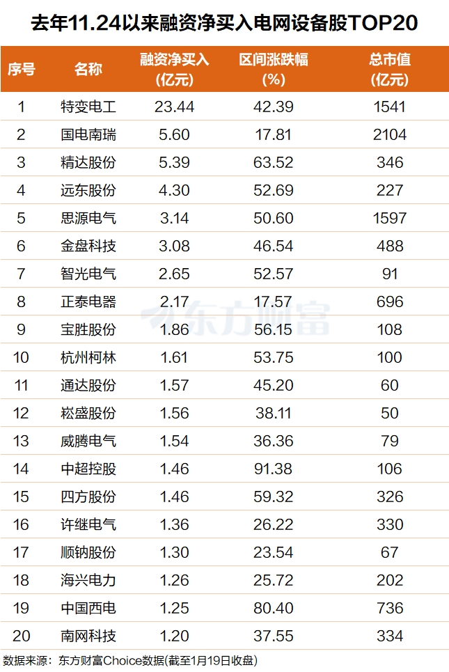 东方财富Choice数据显示,自去年11月24日阶段性见底以来,杠杆资金净买入多只个股,其中特变电工排名第一,融资净买入23亿元,区间涨幅超40%;国电南瑞排名第二,融资净买入近6亿元,区间涨幅近18%。