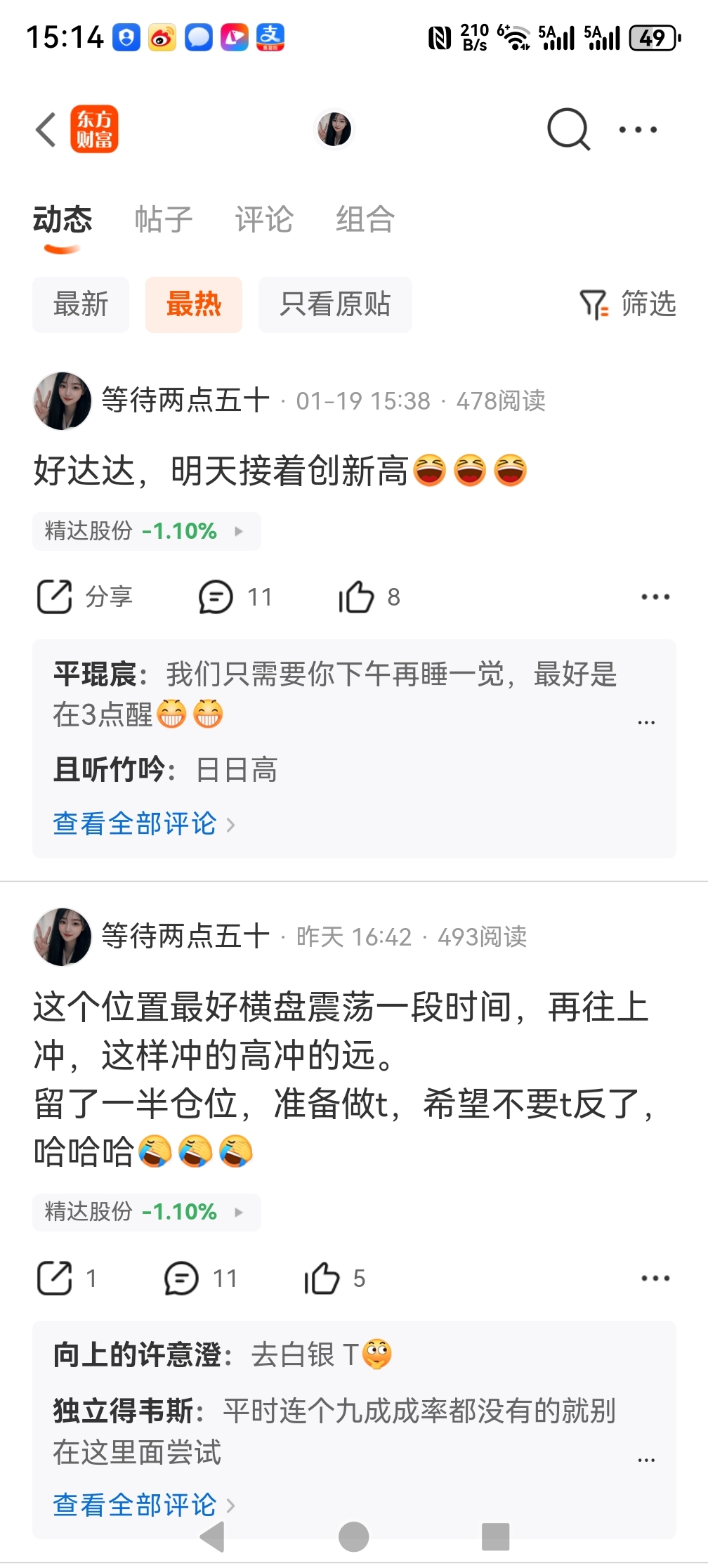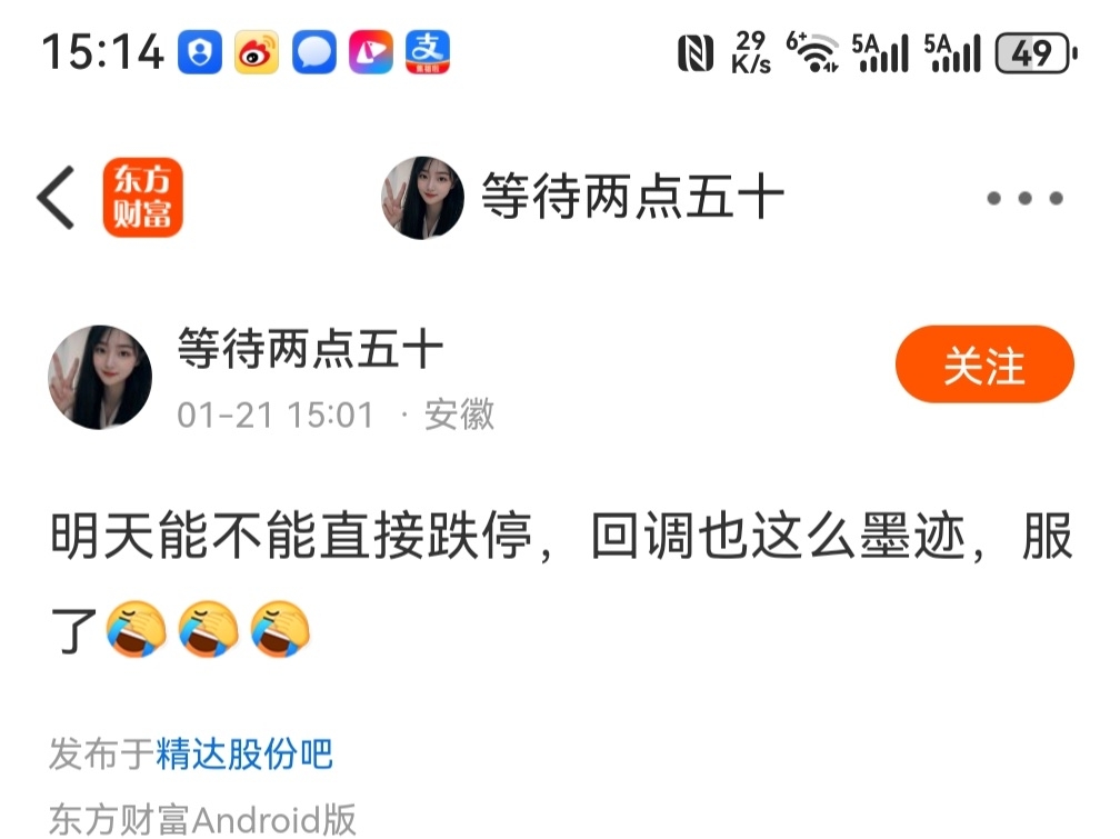 $精达股份(SH600577)$ 咱不知道这是个真老女人,还是抠脚大汉伪装的,只能说良心大大的坏,持仓的时候天天喊达达创新高,这昨天估计开始减仓空仓了今天就喊跌停回调,这种人呐一辈子吃不上俩菜,买进就跌停卖出就涨停的命,实在是太坏了