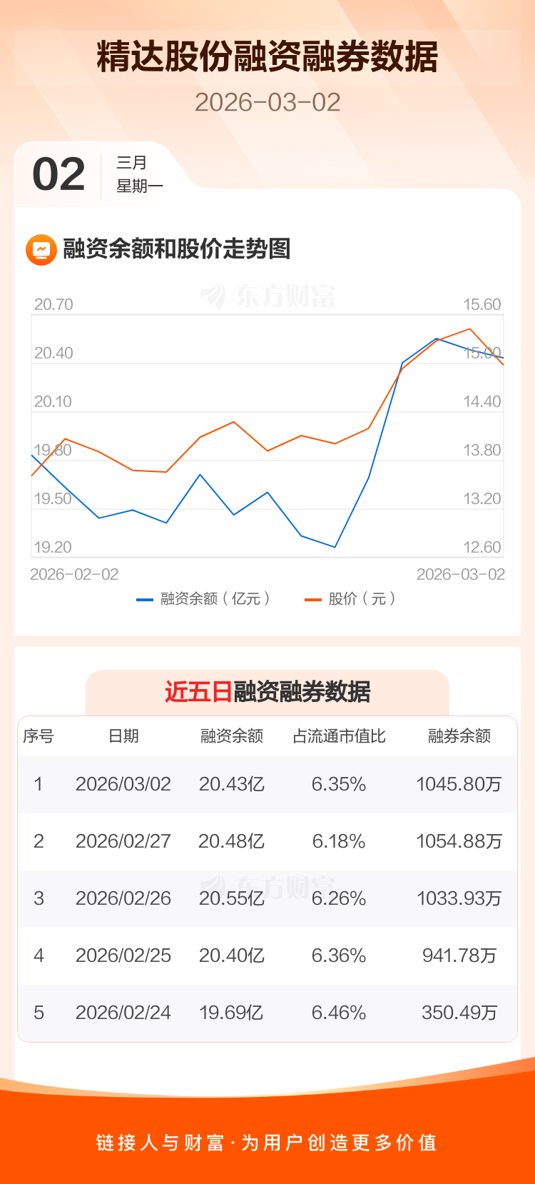 交易所最新数据显示,精达股份于2026年3月2日获融资买入1.26亿元,融资偿还1.30亿元,当日融资净偿还451.2万元。目前,该股融资余额20.43亿,占流通市值比例为6.35%。