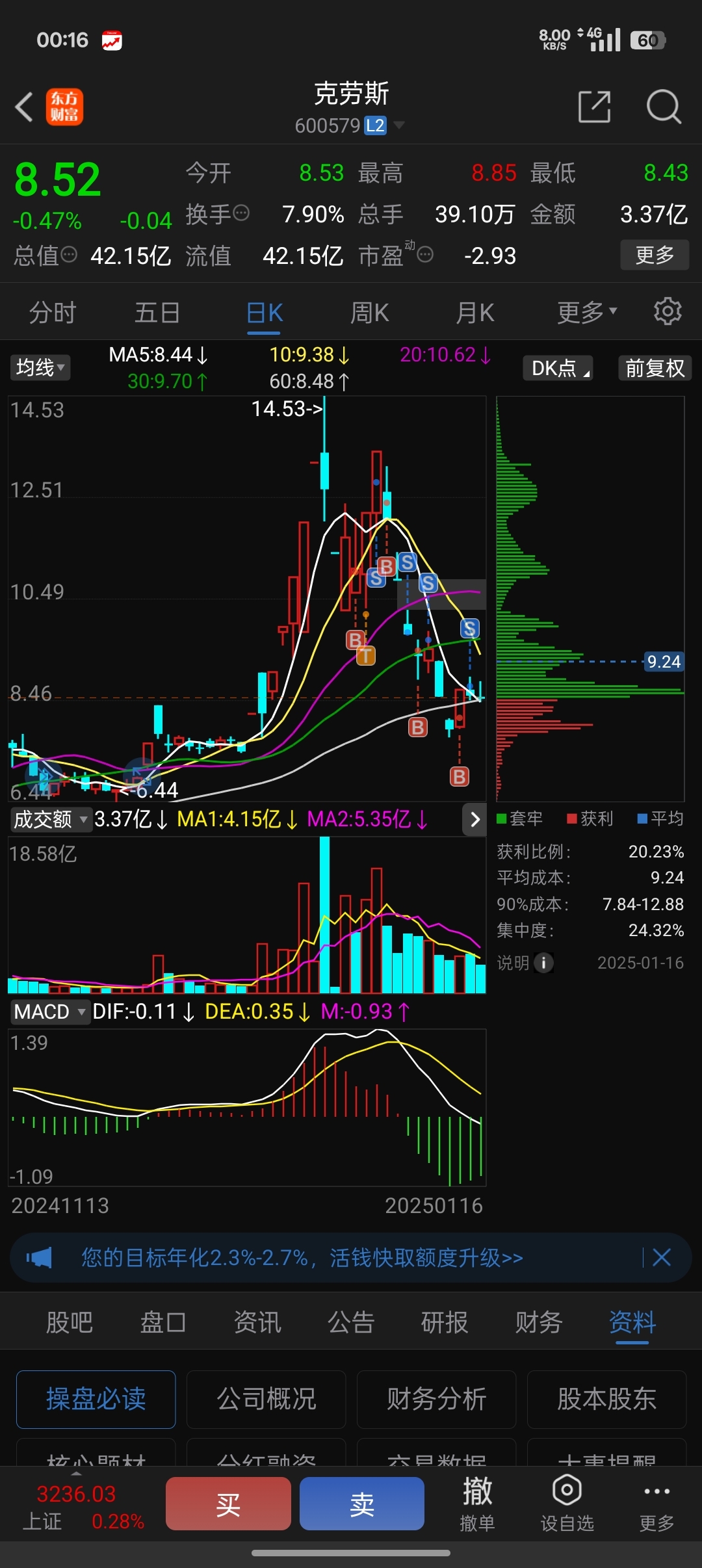 $克劳斯(SH600579)$ 前面几天盈利20%+,一月3号大跌12.40又进去了,结果倒亏20%,9.82再次清仓,后面做了两次差价清了,这股负债率太高,悠着点