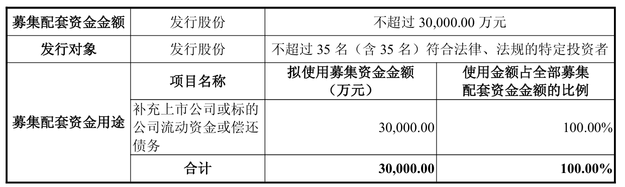 同时,公司拟向不超过35名特定投资者发行股份募集配套资金不超过3亿元,全部用于补充上市公司或标的公司流动资金或偿还债务。