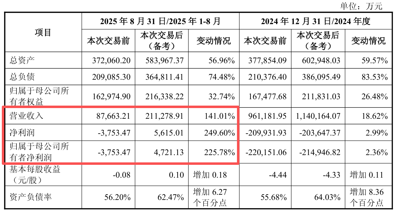 主要财务指标的影响方面,不考虑募集配套资金,本次交易完成后,公司归母净利润将得到增加,2025年1-8月大幅扭亏。2024年度、2025年1-8月上市公司每股收益将得到提升,不存在因本次交易而导致每股收益被摊薄的情况。