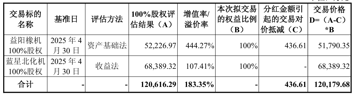 资产评估方面,益阳橡机、北化机分别采用资产基础法和收益法,增值率分别为444.27%、107.41%,评估基准日均为2025年4月30日。益阳橡机分红金额引起的交易对价抵减了436.61万元。
