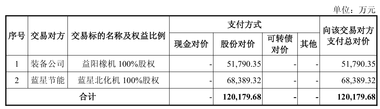 1月9日晚间,中化装备(600579)发布公告称,公司拟向装备公司发行1.96亿股购买其持有的益阳橡机100%股权,向蓝星节能发行1.96亿股购买其持有的蓝星北化机100%股权,向该交易对方支付总对价为12.02亿元。