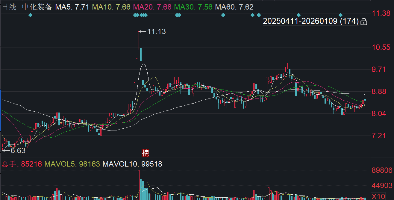 二级市场上,截至1月9日收盘,中化装备下跌0.35%报8.52元/股,总市值约42.05亿元,近一年来公司股价近乎“原地踏步”。