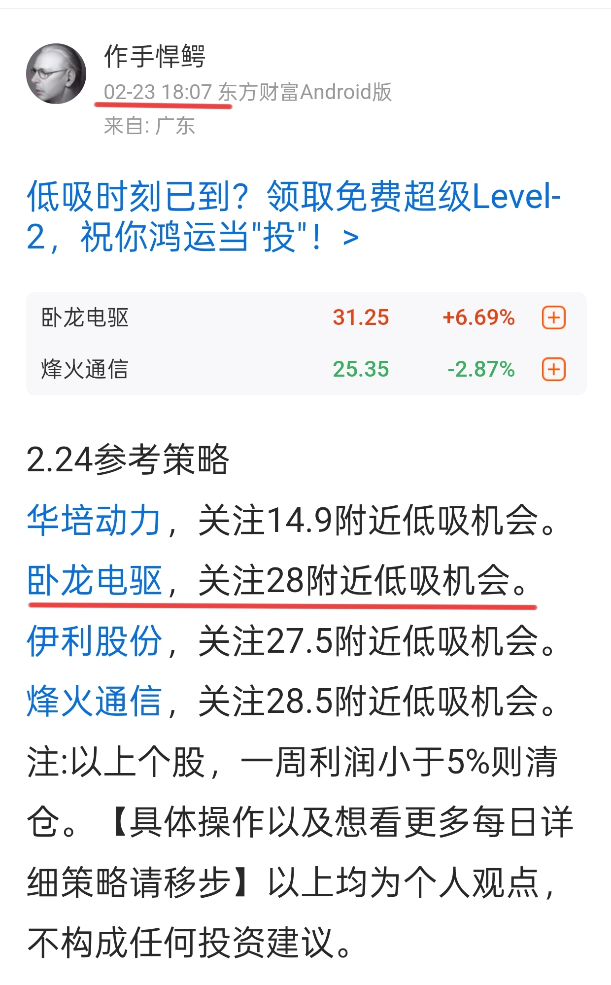 郑重声明:用户在财富号/股吧/博客等社区发表的所有信息(包括但不限于文字、视频、音频、数据及图表)仅代表个人观点,与本网站立场无关,不对您构成任何投资建议,据此操作风险自担。请勿相信代客理财、免费荐股和炒股培训等宣传内容,远离非法证券活动。请勿添加发言用户的手机号码、公众号、微博、微信及QQ等信息,谨防上当受骗!