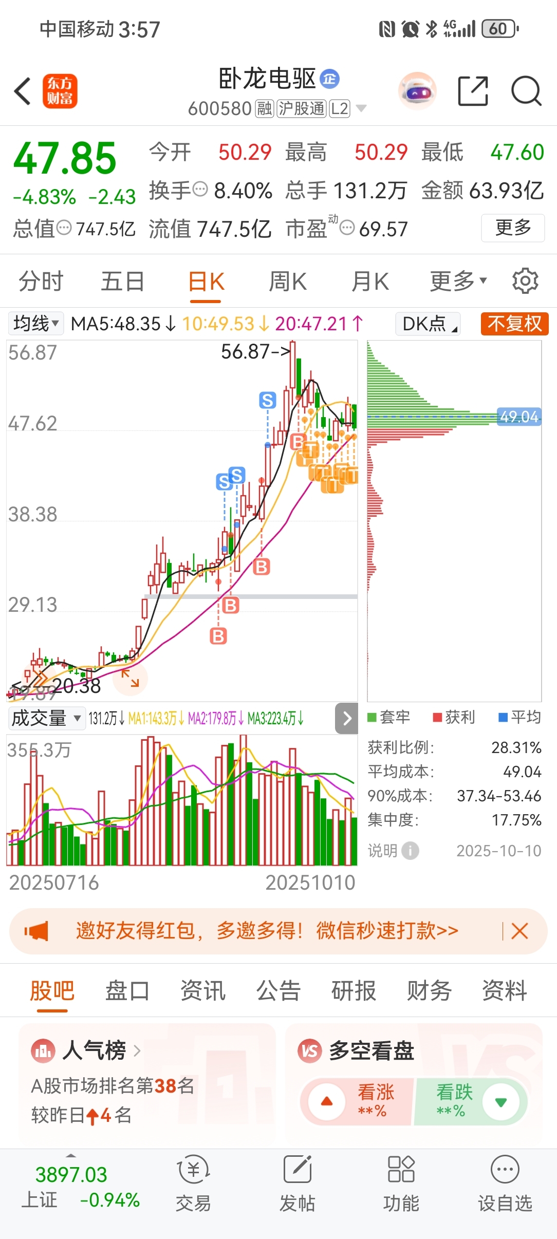 $卧龙电驱(SH600580)$ 管你涨跌就是不走