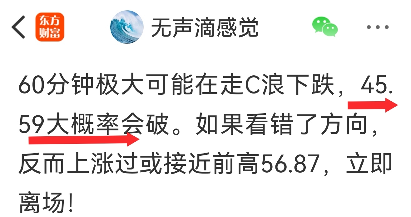 60分钟极大可能在走C浪下跌,45.59大概率会破。如果看错了方向,反而上涨过或接近前高56.87,立即离场!