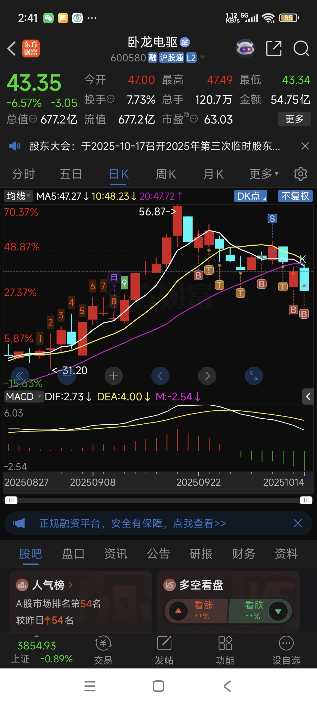 $卧龙电驱(SH600580)$ 9月22号52.12买的,看来真的是高位接盘了!没有遵守短信规矩!应该割肉离场,而不是耗在里面做t!涨幅200%多的票,还在幻想啥!昨天46.05补的没t成功,今天44.14补的又没及时t出!常在河边走,哪有不湿鞋,太残酷了