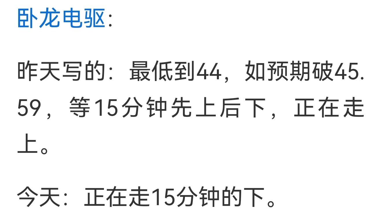 10月13日:最低到44,如预期破45.59,等15分钟先上后下,正在走上。